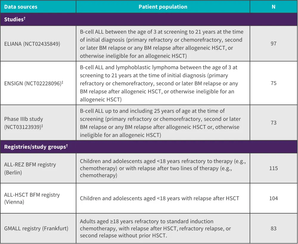 †Time periods: ELIANA: data cut from July 1, 2019; ENSIGN-LTFU: final data cut from May 24, 2019, data cut from May 2020 for EMA submission; phase IIIb study-LTFU: data until last patient’s last visit on October 13, 2020, data cut from May 2020 for EMA submission; ALL-REZ BFM: included until September 2017, with the longest possible follow-up period, but at least until the end of 2019; ALL-HSCT BFM: recruitment until 2013 with longest follow-up period, data cut from 2017; GMALL: included until September 2017, with the longest possible follow-up period, but at least until the end of 2019.