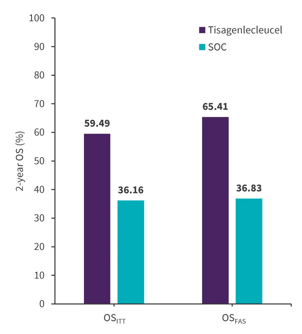 A significant OS benefit was seen in the tisagenlecleucel group with an adjusted hazard ratio (HR)ITT of 0.54 (95% Cl, 0.41–0.71; p < 0.001) and HRFAS of 0.47 (95% Cl, 0.35–0.62; p < 0.001) vs SOC at 2 years (Figure 2). For OSITT, the median follow-up was 22.5 months for tisagenlecleucel vs 60.5 months for SOC; the median follow-up for OSFAS was 30.2 months (range, 28.1–34.9 months) vs 60.5 months (range, 48.2–75.3 months) in the tisagenlecleucel and SOC group, respectively.