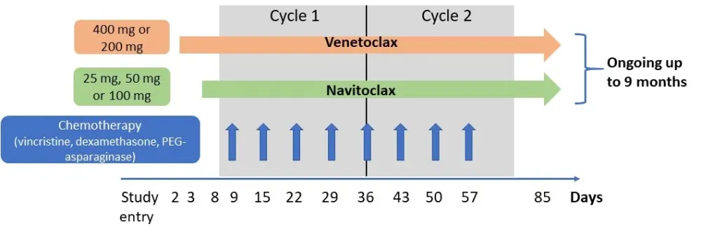 Despite the development of novel therapeutic and chemotherapeutic agents, a great percentage of patients with relapsed or refractory (R/R) acute lymphoblastic leukemia (ALL) or lymphoblastic lymphoma (LL) respond badly to treatment and have poor prognosis.1 Effective anti-leukemic activity in ALL xenografts seems to be achieved when venetoclax, a highly selective B-cell lymphoma-2 (BCL-2) inhibitor, is combined with the anti-BCL-2 and anti-BCL-extra-large (BCL-XL) inhibitor, navitoclax.2 These findings indicate that a dual BCL-2 and BCL-XL inhibition might provide a new treatment combination for patients with R/R ALL or LL.